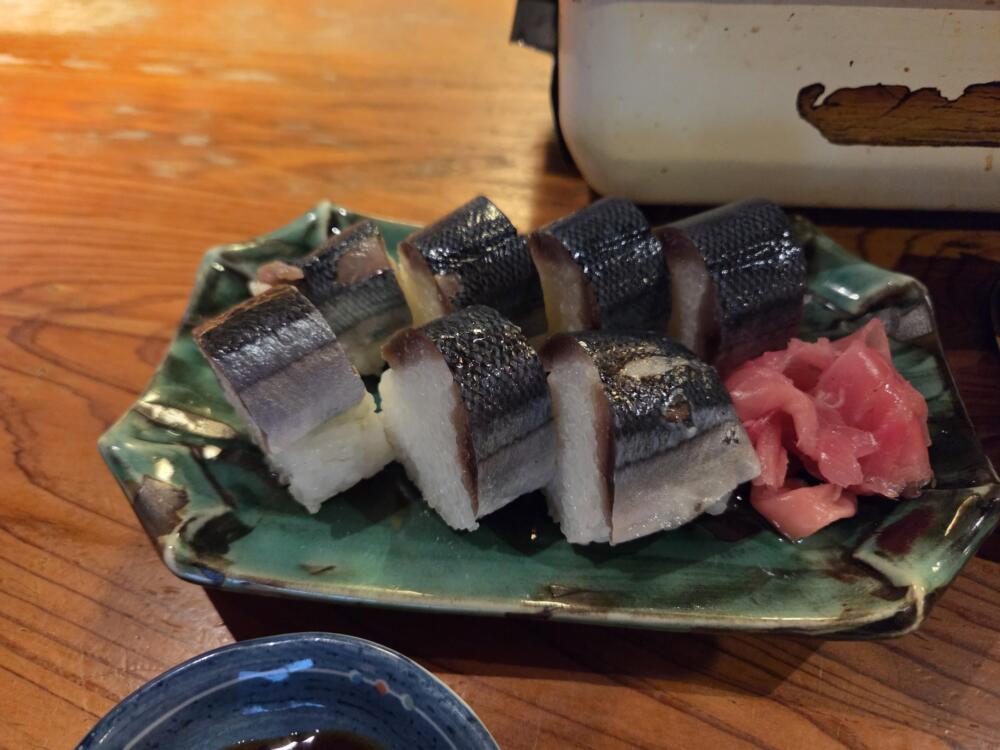 変な和え物、これはクジラ。独特の食感と味が癖になる。酒が進む。寿司、これはサンマ。青魚の寿司とか、小さい頃は回転寿司とかで絶対食べなかったけど、酒飲むようになってからのこれは神。うまい。