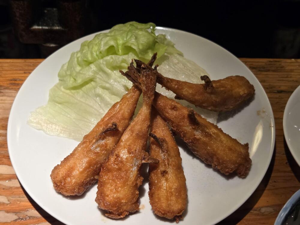 くじらやら寿司やらで微妙にお腹が満たされているところだけど、メニューのフグの唐揚げの文字に勝てず注文してでてきたもの。まさかこの形ででてくるとは。刺し身のフグのコリッと感が残りつつ、ふわっとしていて不思議な感じ。美味しい。
