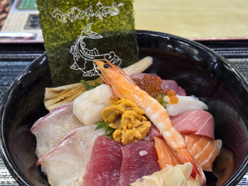 とれとれ市場で海鮮丼をいただきます。とれとれ市場、中身が完全にら・ら・ミュウだ…(福島県育ち並感)魚介のものが売っているだけでなく、お土産も充実してました。お酒コーナーも広かったですね。